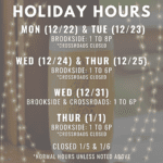 - Brookside tasting room is open Mon-Thur 4 to 8pm, Fri/Sat 1 to 8pm & Sun 1 to 6pm for tap pours & to-go beer.